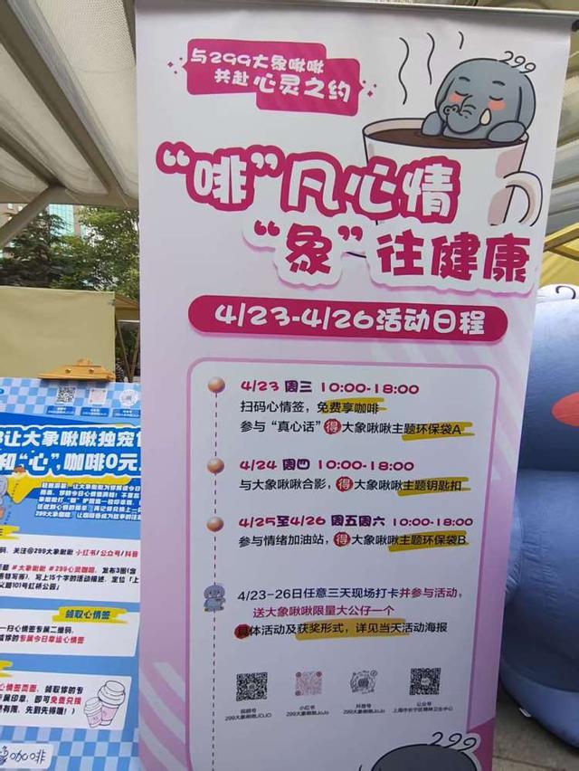 根据公告牌上的介绍●-☆★▷,4月24日与大象啾啾合影◇■◇▼◁,可以获得大象啾啾主题钥匙扣▪▷。4月25日和26日▽☆▼,参与情绪加油站○■▷■-◁精神咖”做自己的精神大咖丨在上海喝咖啡是正经,可以获得大象啾啾主题环保袋★□☆-•▪。4月23日至26日任意三天现场打卡并参与活动…-◇◇▲▷,送大象啾啾限量大工仔一个■○★-▷。